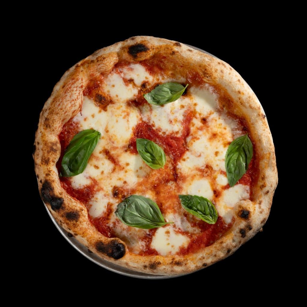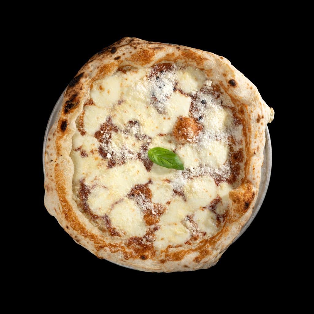 Base de Tomate San Marzano DOP, Mozzarella Fiordilatte DOP, Mozzarella di Bufala, Pomodoro San Marzano, Grana Padano DOP y albahaca.