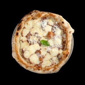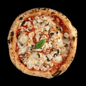 Base de Tomate San Marzano DOP, Mozzarella Fiordilatte DOP, champiñones frescos, Gorgonzola DOP y ajo.