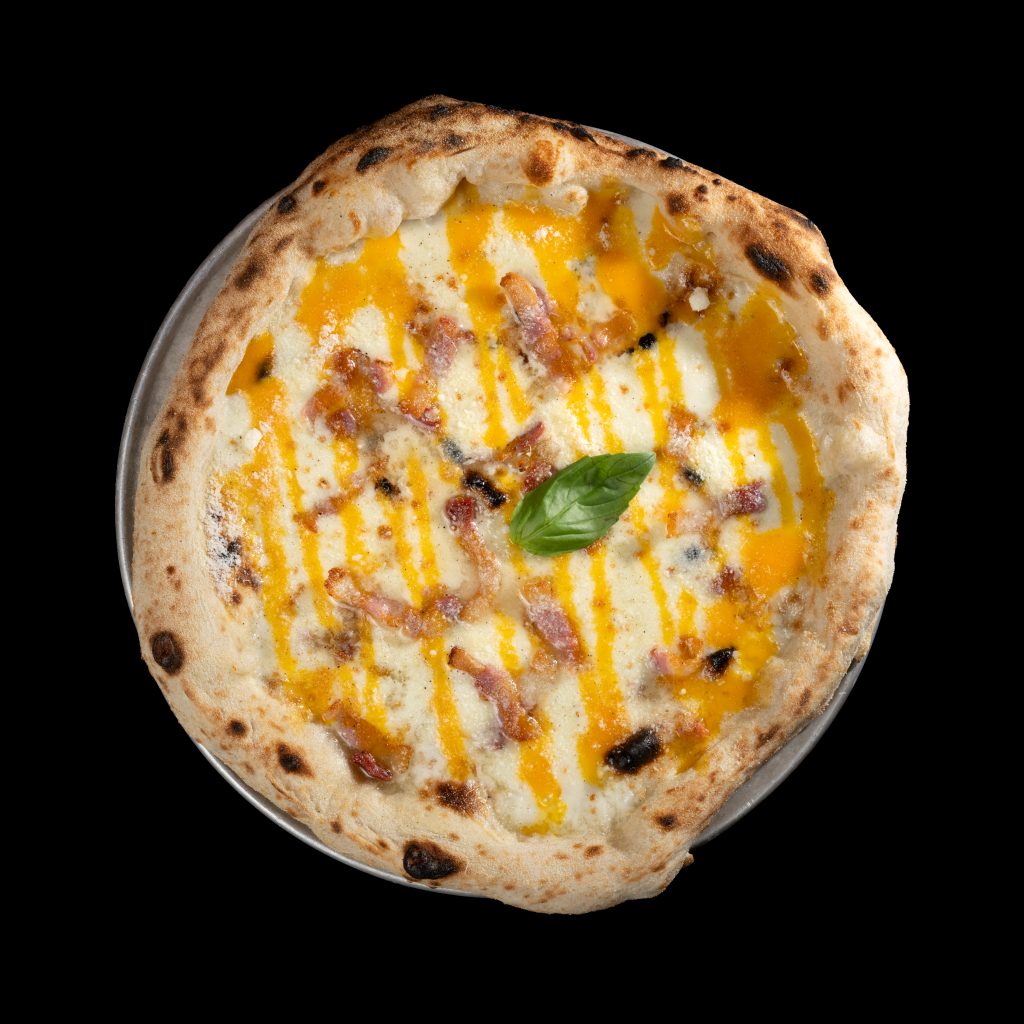 Base de Mozzarella Fiordilatte DOP, yema de huevo, Guanciale romano (tipo bacon), Pecorino Romano DOP, toque de pimienta negra y albahaca.