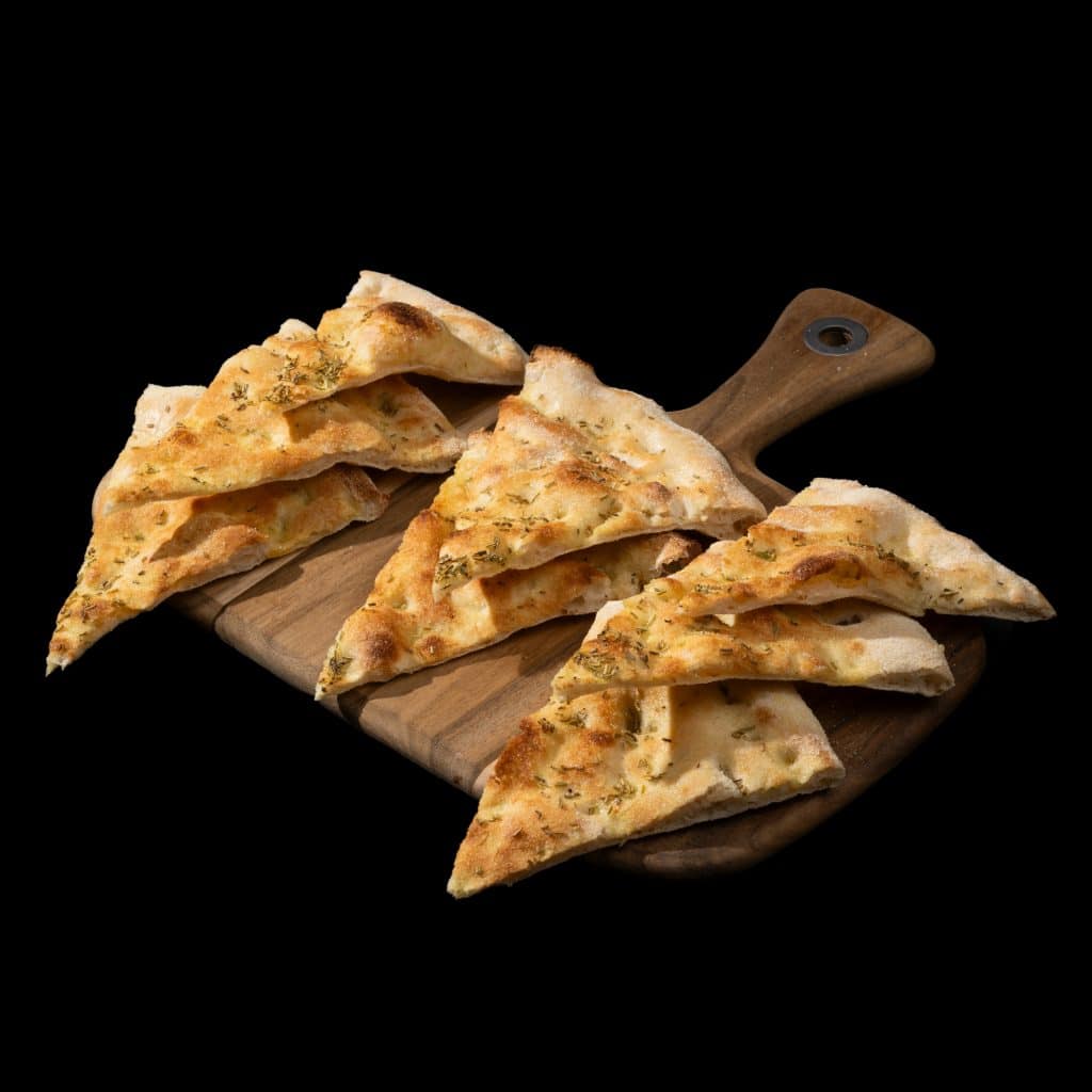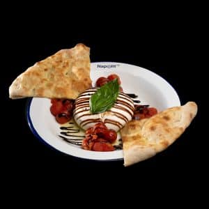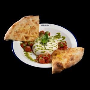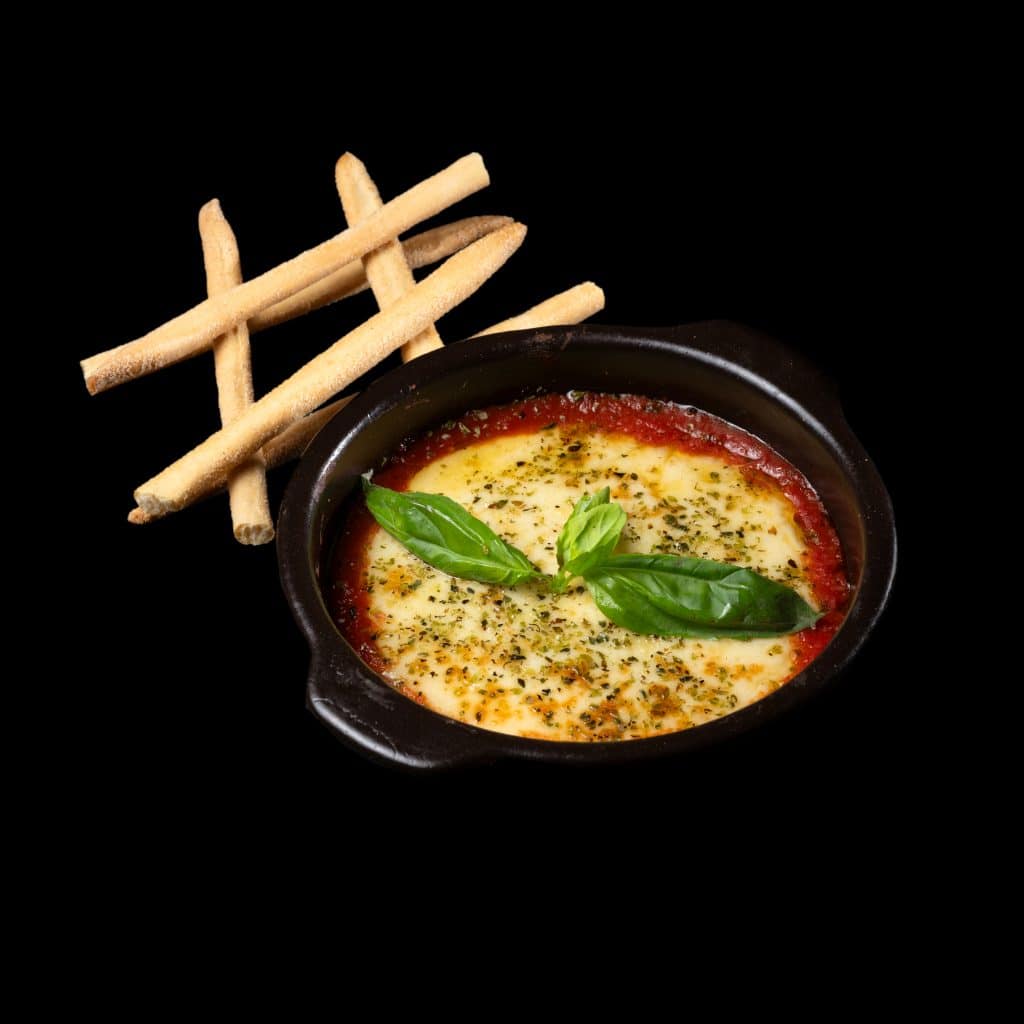 Salsa de tomate San Marzano, queso Provolone y orégano. Acompañado de panecillos Grissini.