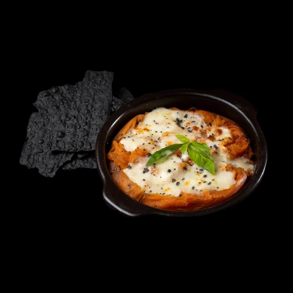 Boniato asado, Mozzarella Fior di Latte, queso Gorgonzola y AOVE. Acompañado de pan sardo negro.