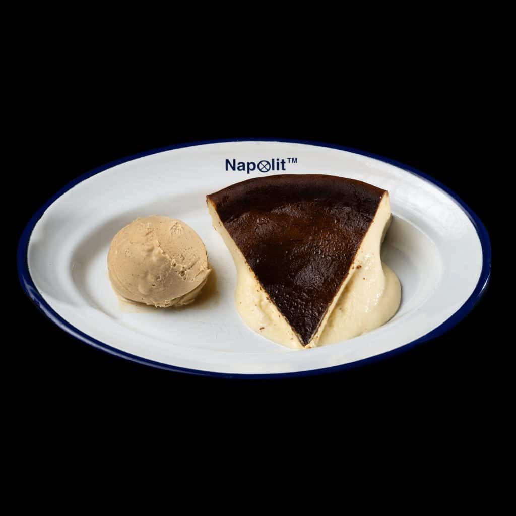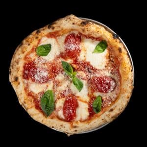 Base de Tomate San Marzano DOP, Mozzarella Fiordilatte DOP, Spianata Napoletana picante, espuma de ricotta, toque de pimienta negra y albahaca.