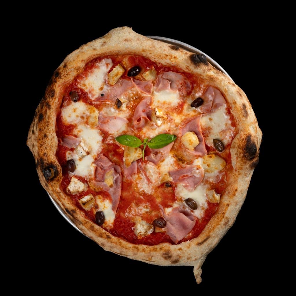 Base de Tomate San Marzano DOP, Mozzarella Fiordilatte DOP, Prosciutto Cotto italiano, queso de cabra, Gorgonzola DOP, aceitunas y albahaca.