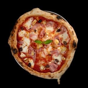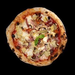 Base de Tomate San Marzano DOP, Mozzarella Fiordilatte DOP, Prosciutto Cotto, Salame Napoli, champiñones frescos, alcachofas, aceitunas y albahaca.