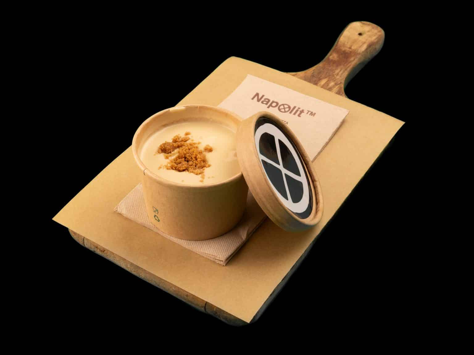 Base de Mozzarella Fiordilatte DOP, crema de Pistachos del Bronte, Mortadella trufata IGP, espuma de ricotta, pistachos crunchy y albahaba.