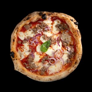Base de Tomate San Marzano DOP, Mozzarella Fiordilatte DOP, atún del norte, cebolla, albahaca.