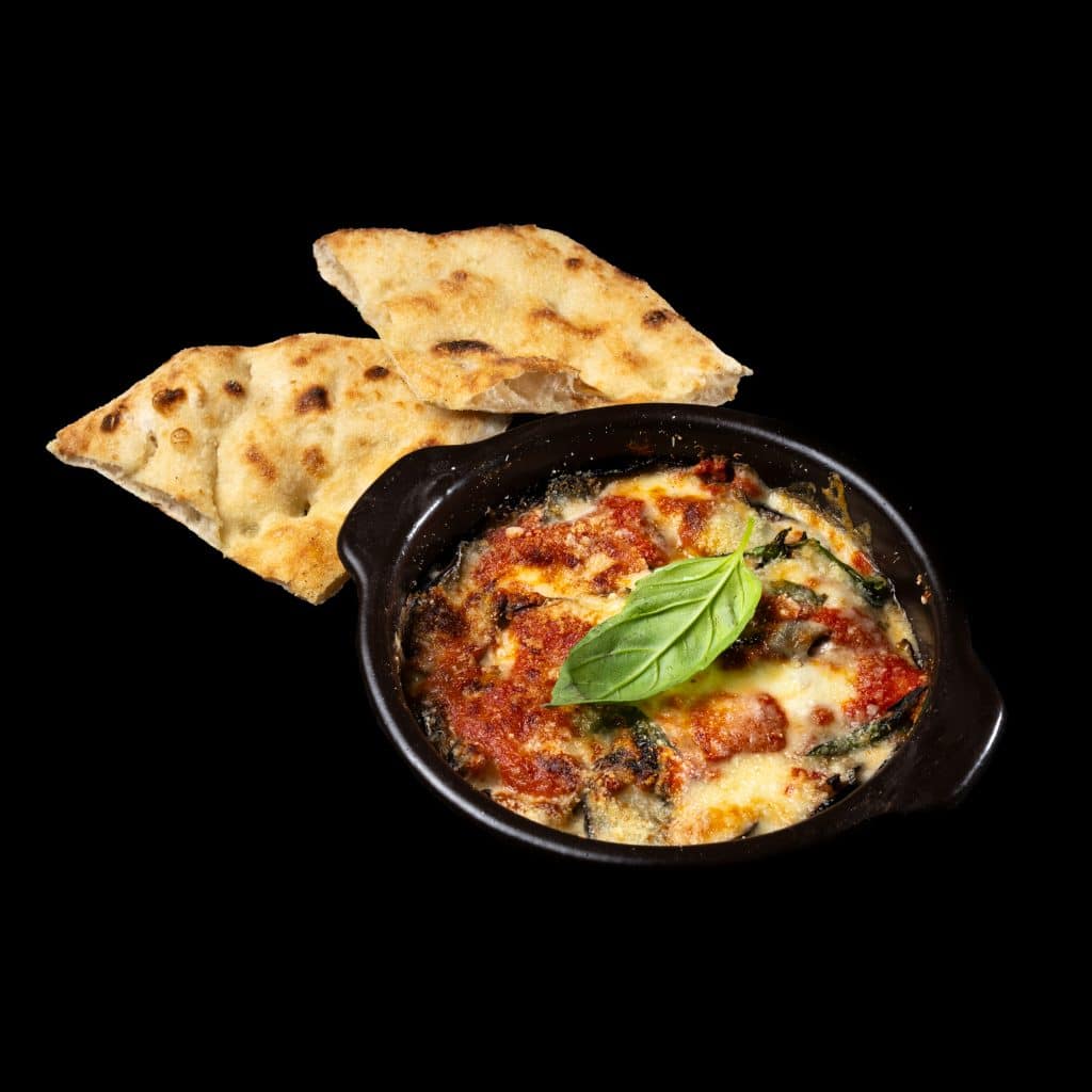 Salsa de tomate San Marzano, berenjena, Mozzarella Fior di Latte, queso Grana Padano y albahaca. Acompañado de focaccia.