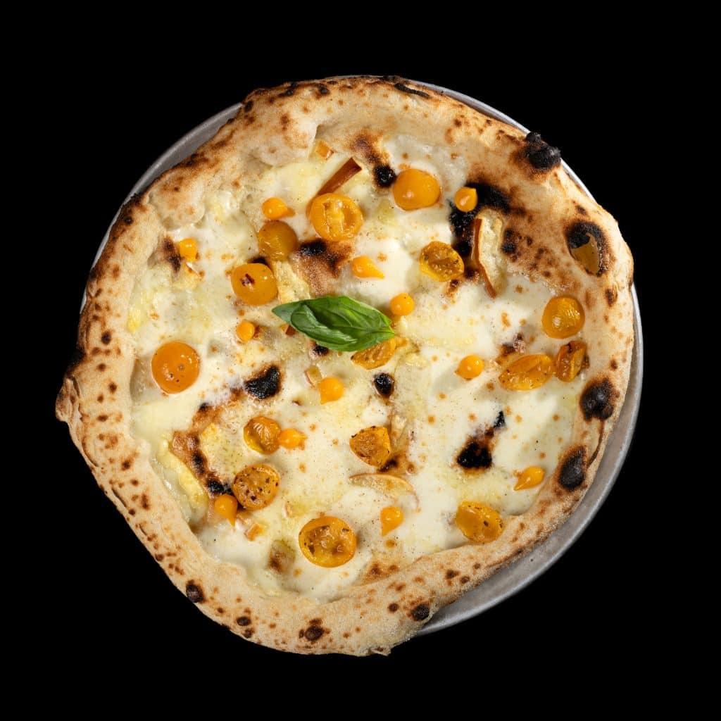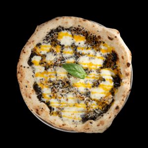 Base de Tomate San Marzano DOP, Mozzarella Fiordilatte DOP, champiñones frescos, Trufa negra, Mortadella trufata IGP, aceite de trufa blanca y albahaca.