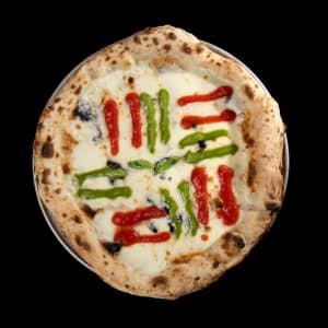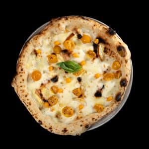 Base de Tomate San Marzano DOP, Mozzarella Fiordilatte DOP, champiñones frescos, tomates cherrys asados al horno, berenjena, cebolla, aceitunas y albahaca.
