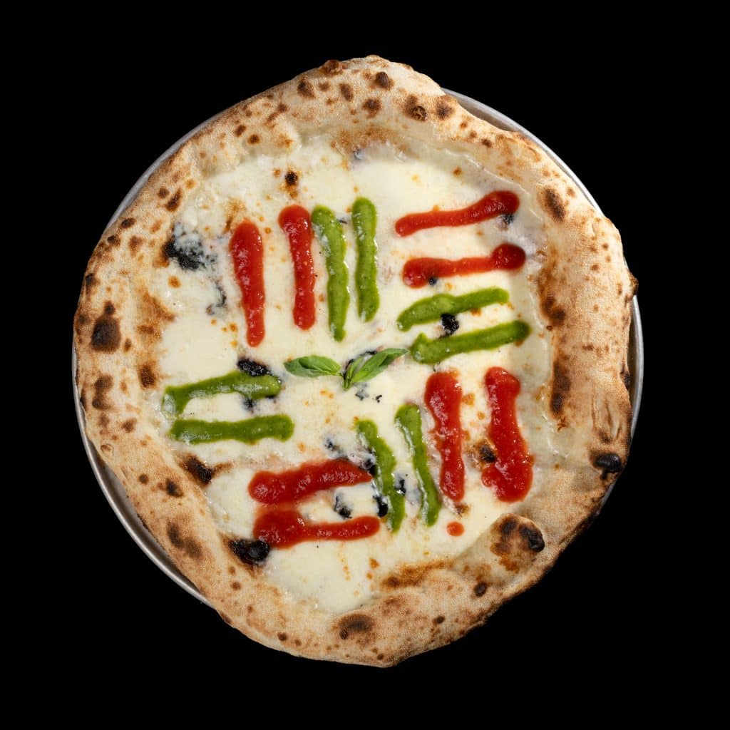 Base de Mozzarella Fiordilatte DOP, salsa de Tomate San Marzano DOP, salsa pesto y albahaca