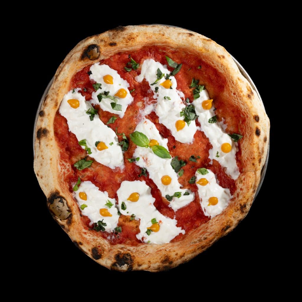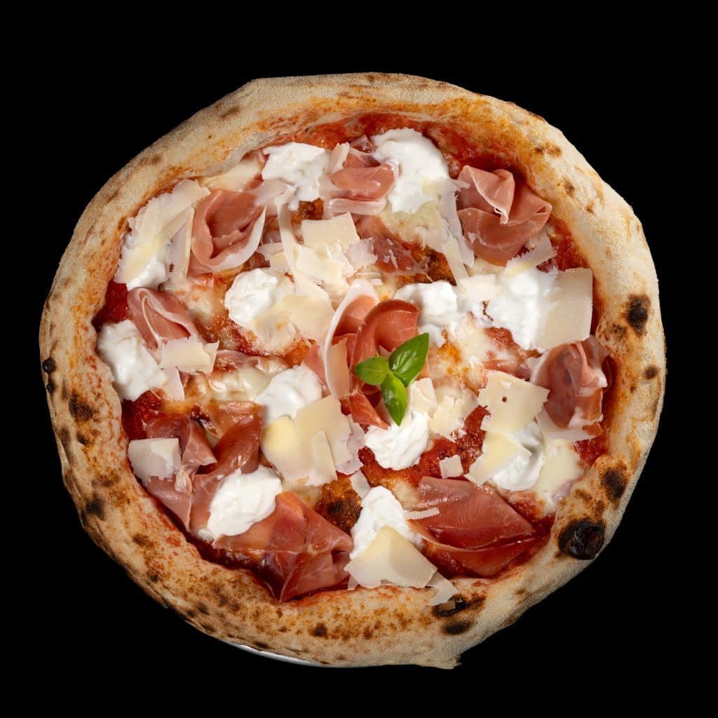 Base de Tomate San Marzano DOP, Mozzarella Fiordilatte DOP, Stracciatella, Prosciutto di Parma DOP, Parmiggiano Reggiano DOP y albahaca.