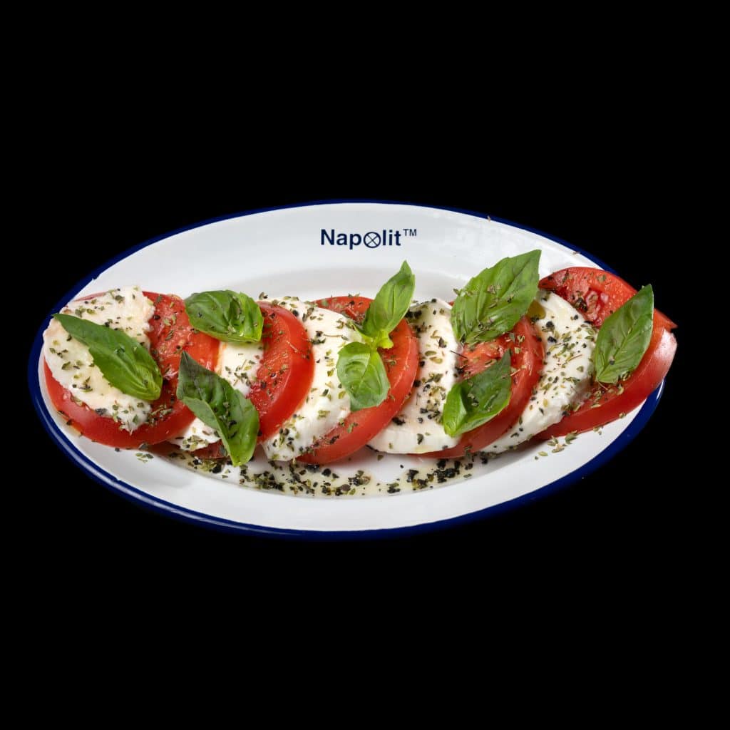 Tomate de temporada, Mozzarella di Buffala, albahaca y AOVE.
