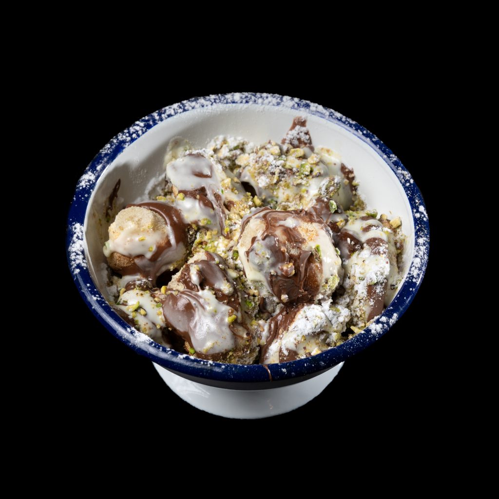 Bolas de masa de pizza acompañadas de Nutella, nutella blanca y pistachos crunchy.