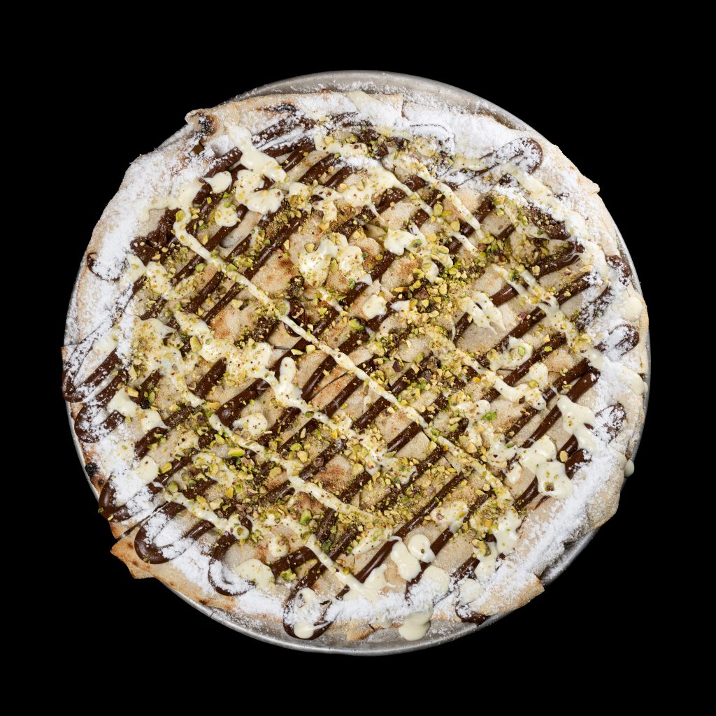 Nuestra famosa pizza de Nutella, con nutella blanca y pistachos crunchy.