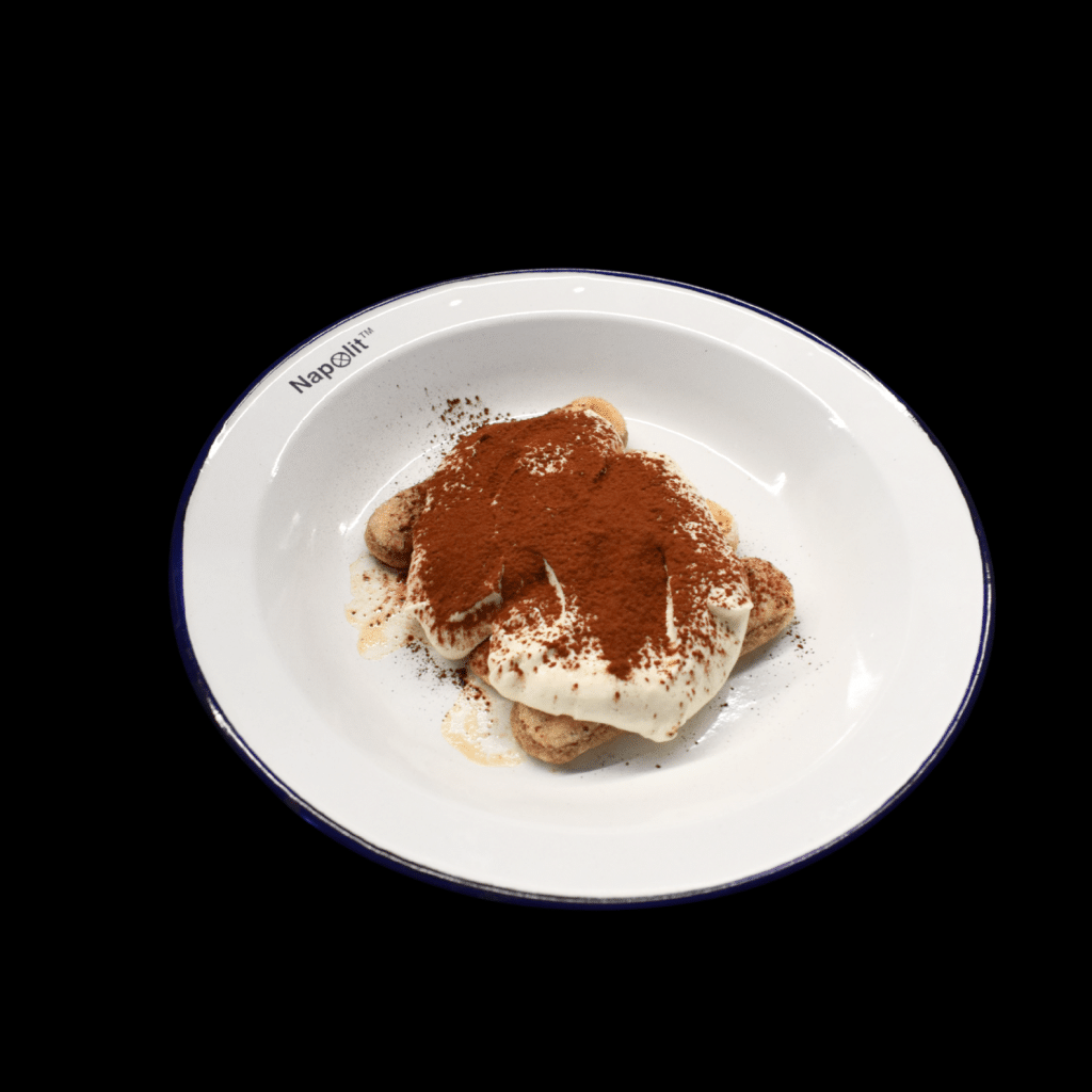 Base de pastas empapadas en café cubiertas de crema de queso mascarpone y cacao.
