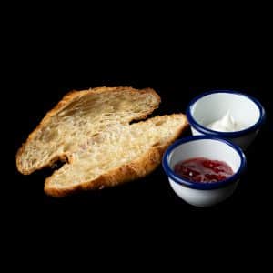 Bruschetta de mermelada de fresa con queso mascarpone.