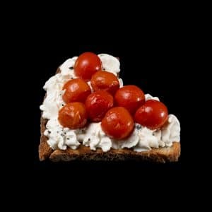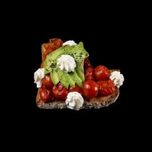 Bruschetta de aguacate, espuma de ricotta, cherrys asados al horno y AOVE.
