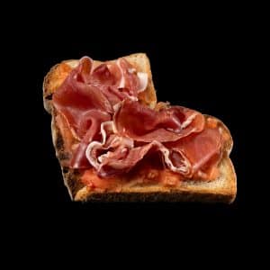 Bruschetta con Tomate, Prosciutto di Parma, Parmiggiano Reggiano DOP y AOVE.